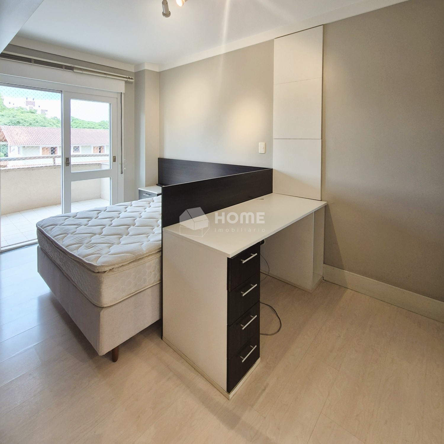 • Dormitório solteiro, com espaço home-office e sacada aberta;