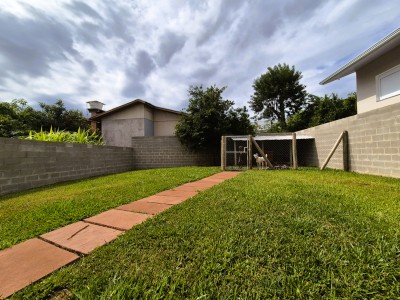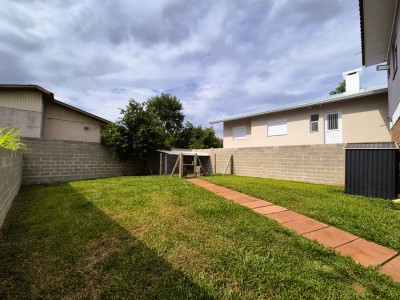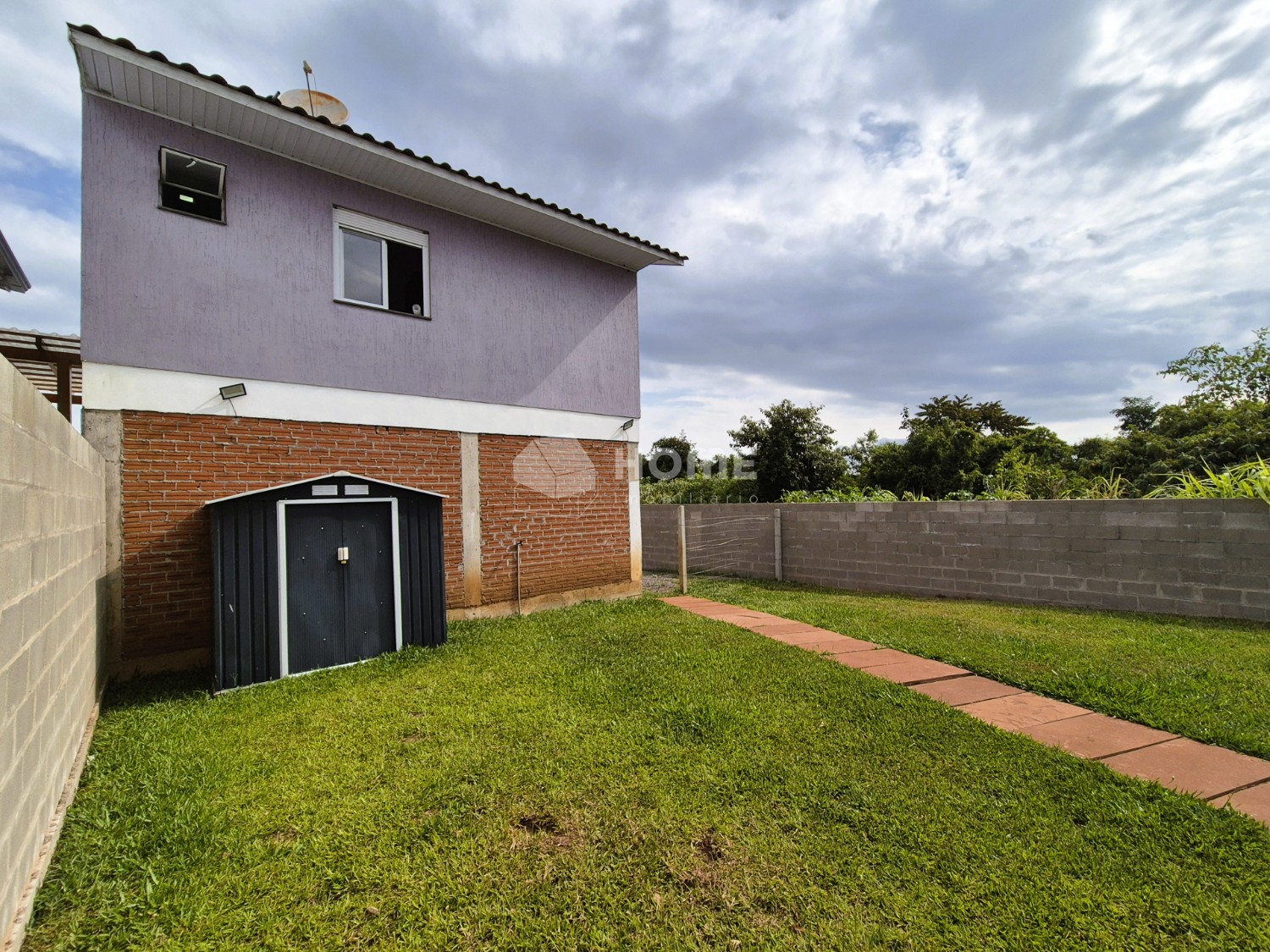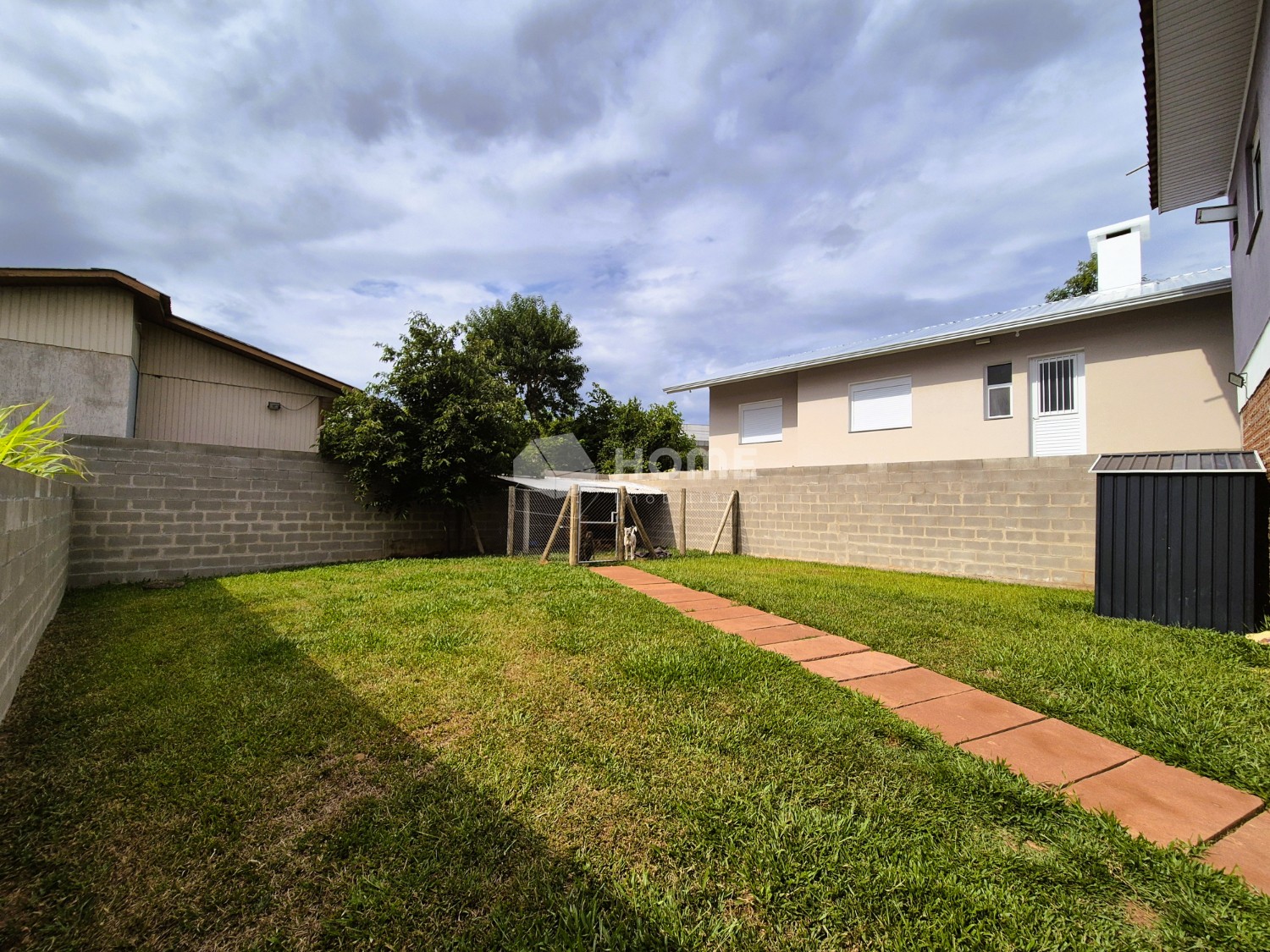Pátio completamente cercado, com um lindo gramado, canil e casa de materiais.